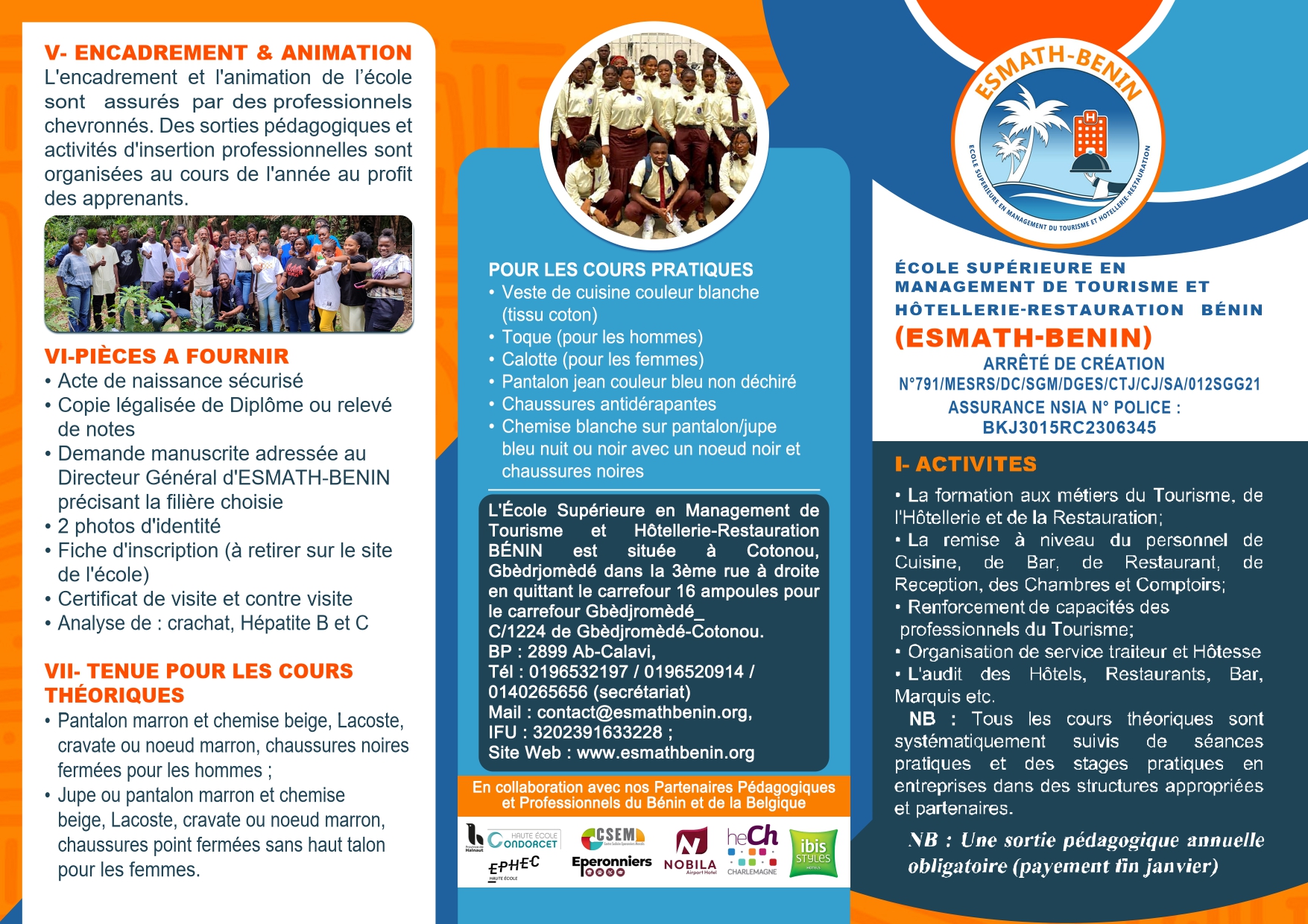 Haute école de Condorcet de la province de Hainaut, Haute Ecole de Charlemagne, EPHEC, Ibis Styles hotels en Belgique, Partenariat stratégique avec Nobila Airport Hôtel (Hôtel d’application ESMATH BENIN), Agence de voyage Wa Africa, Agence Sena tour travel, agence de voyage et de tourisme Afrique destination, Novotel Ibis Cotonou, KLIK KLAK Apart, Okrytours Bénin, UAC, Hôtel du Lac, Groupe Empire, Résidence LAcarafe, etc.